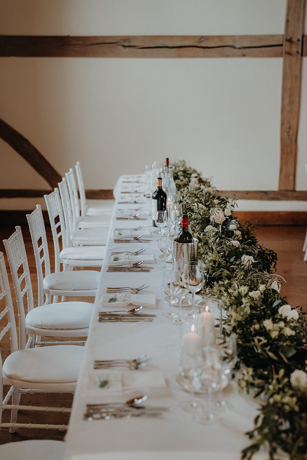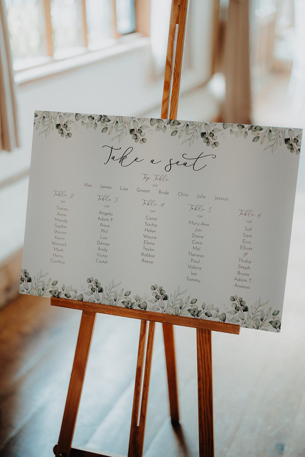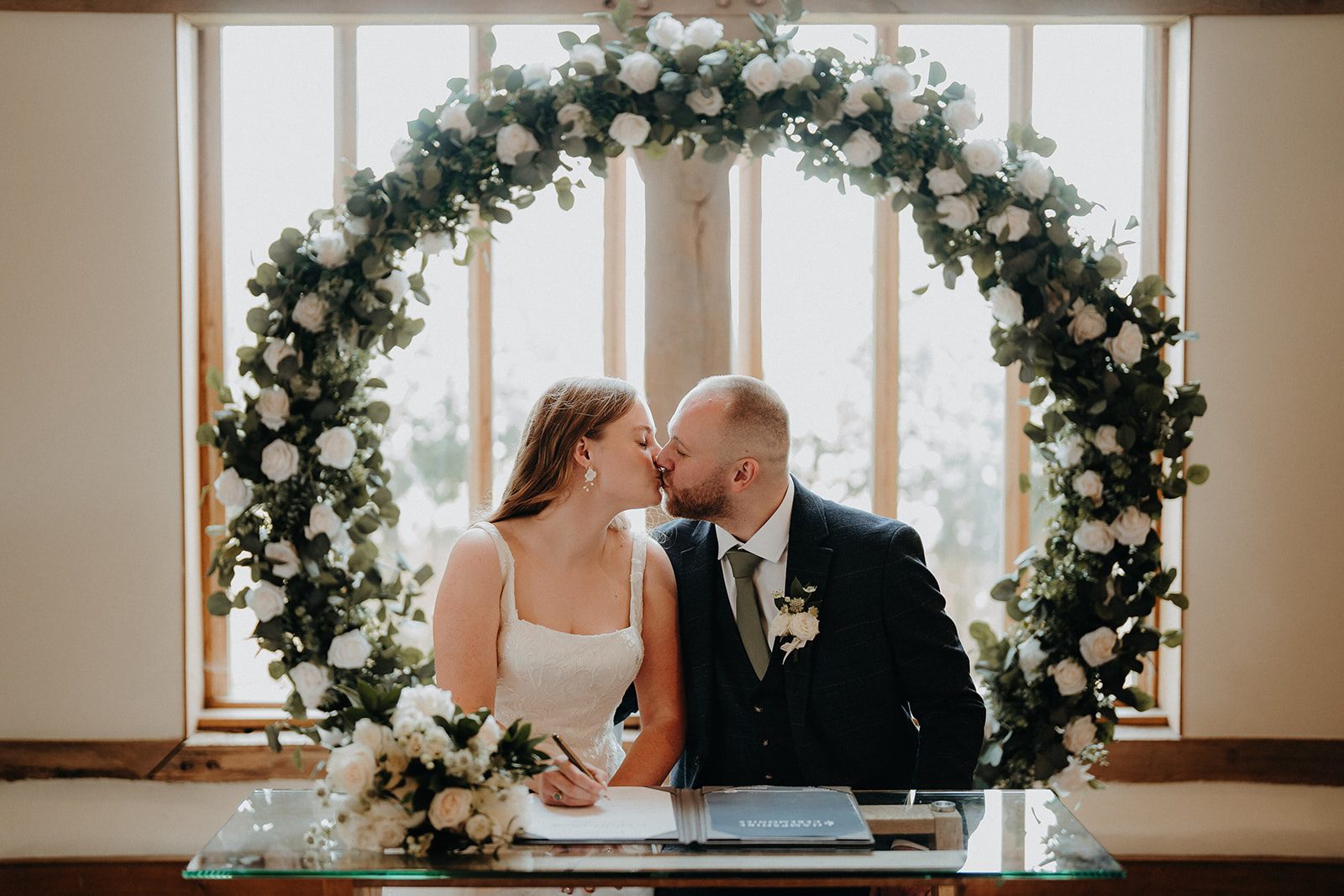 Opting for an intimate indoor ceremony Alicia & Matt said their “I do’s” in front of 60 of their nearest and dearest. Their backdrop was framed by a large floral hoop of white roses and greenery and soft spring light pouring through the floor to ceiling window. This timeless, neutral palette became the thread that tied the whole day together – from Alicia’s bridal bouquet and Matt’s buttonhole to the wedding breakfast centrepieces, the white three-tiered wedding cake, and the printed table plan featuring eucalyptus.