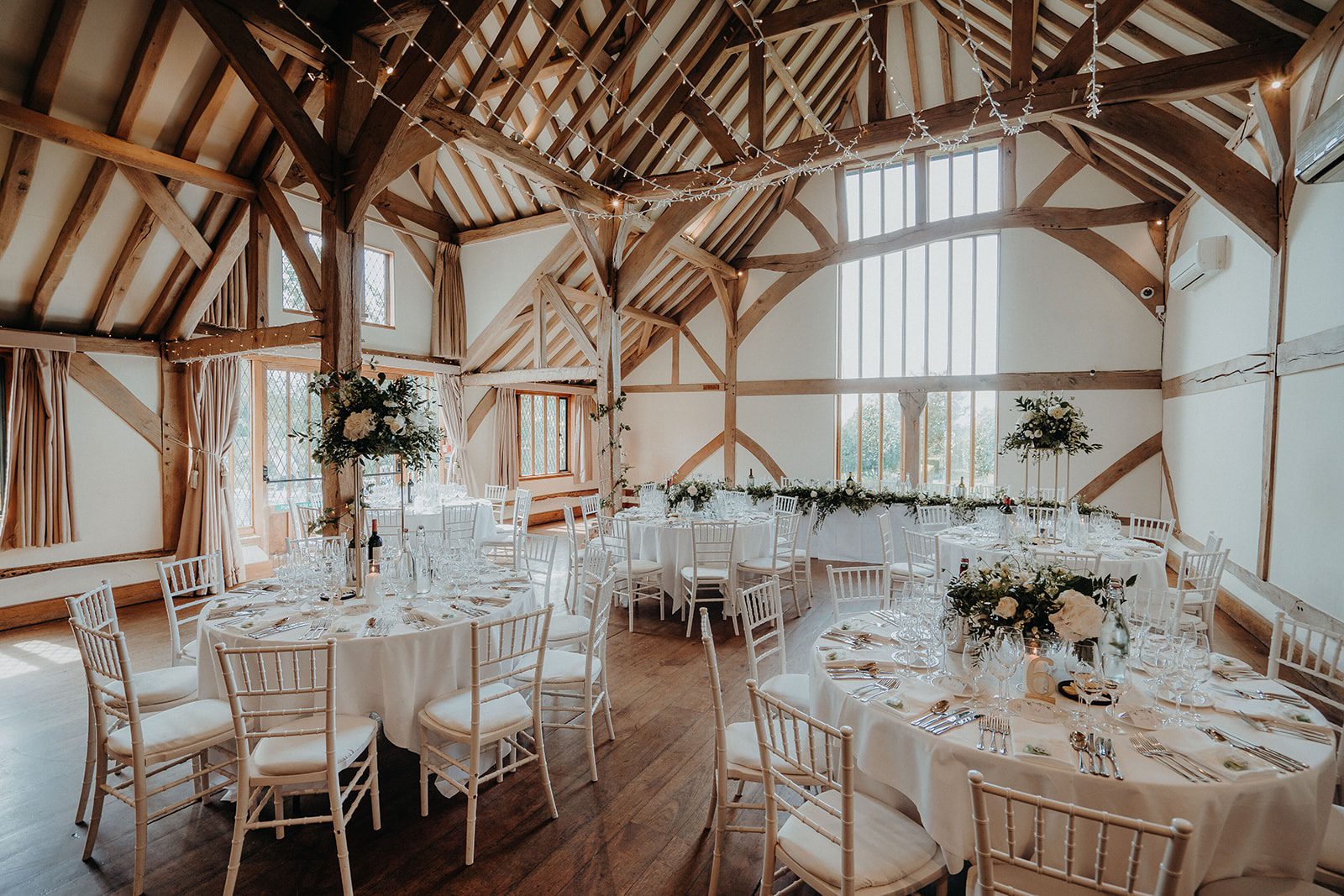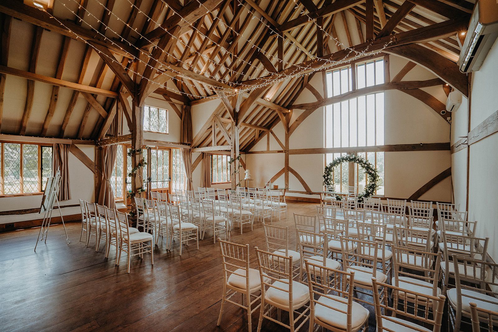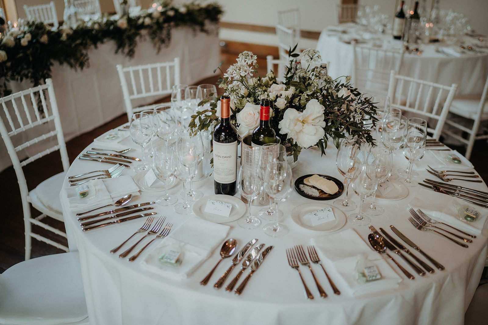 Opting for an intimate indoor ceremony Alicia & Matt said their “I do’s” in front of 60 of their nearest and dearest. Their backdrop was framed by a large floral hoop of white roses and greenery and soft spring light pouring through the floor to ceiling window. This timeless, neutral palette became the thread that tied the whole day together – from Alicia’s bridal bouquet and Matt’s buttonhole to the wedding breakfast centrepieces, the white three-tiered wedding cake, and the printed table plan featuring eucalyptus.