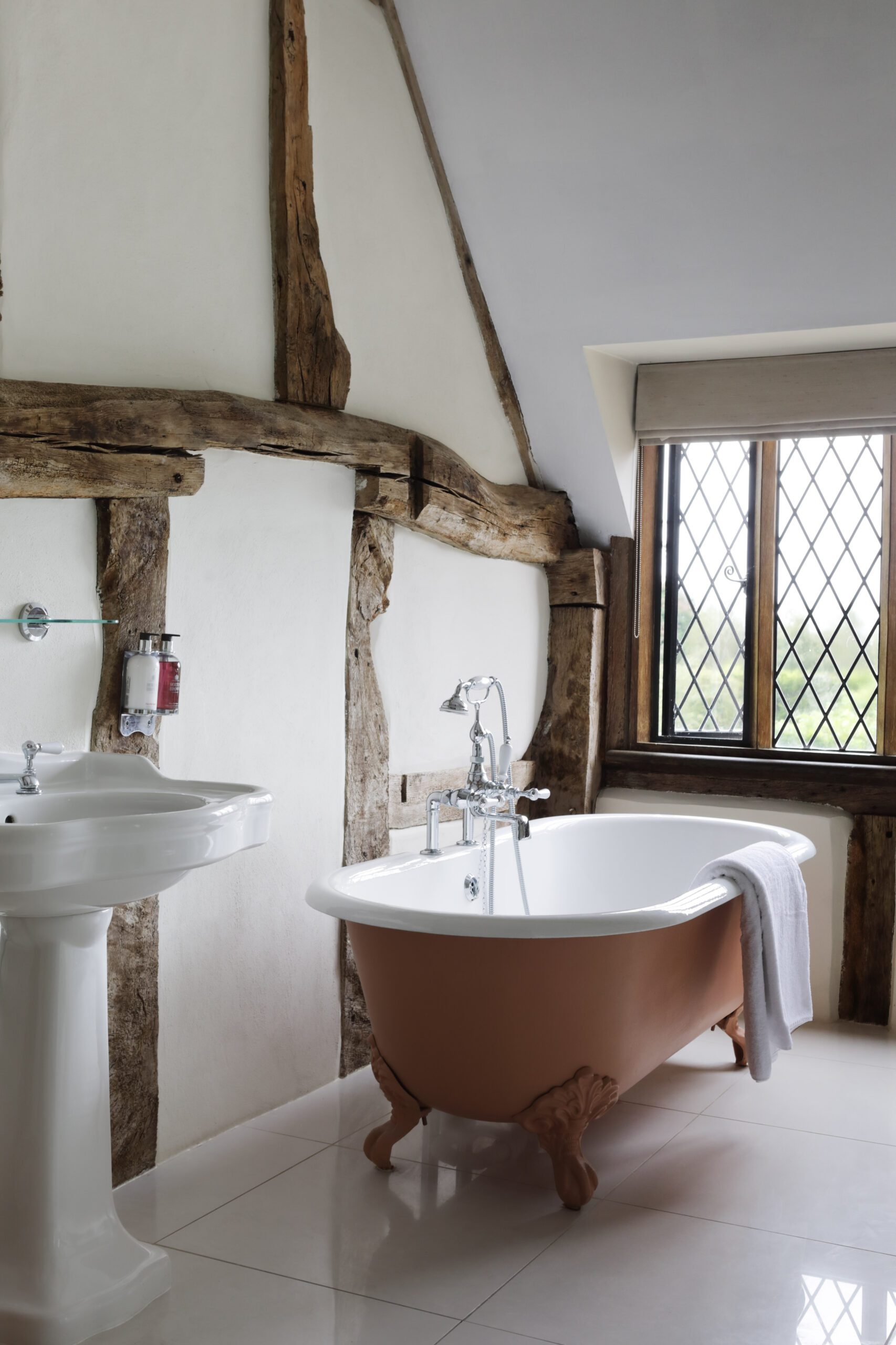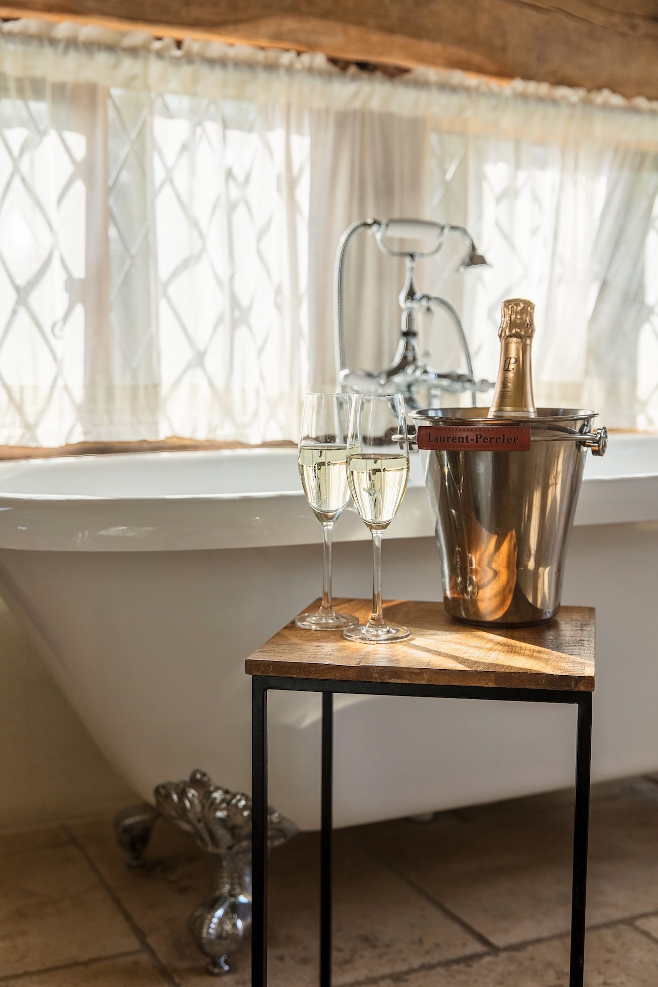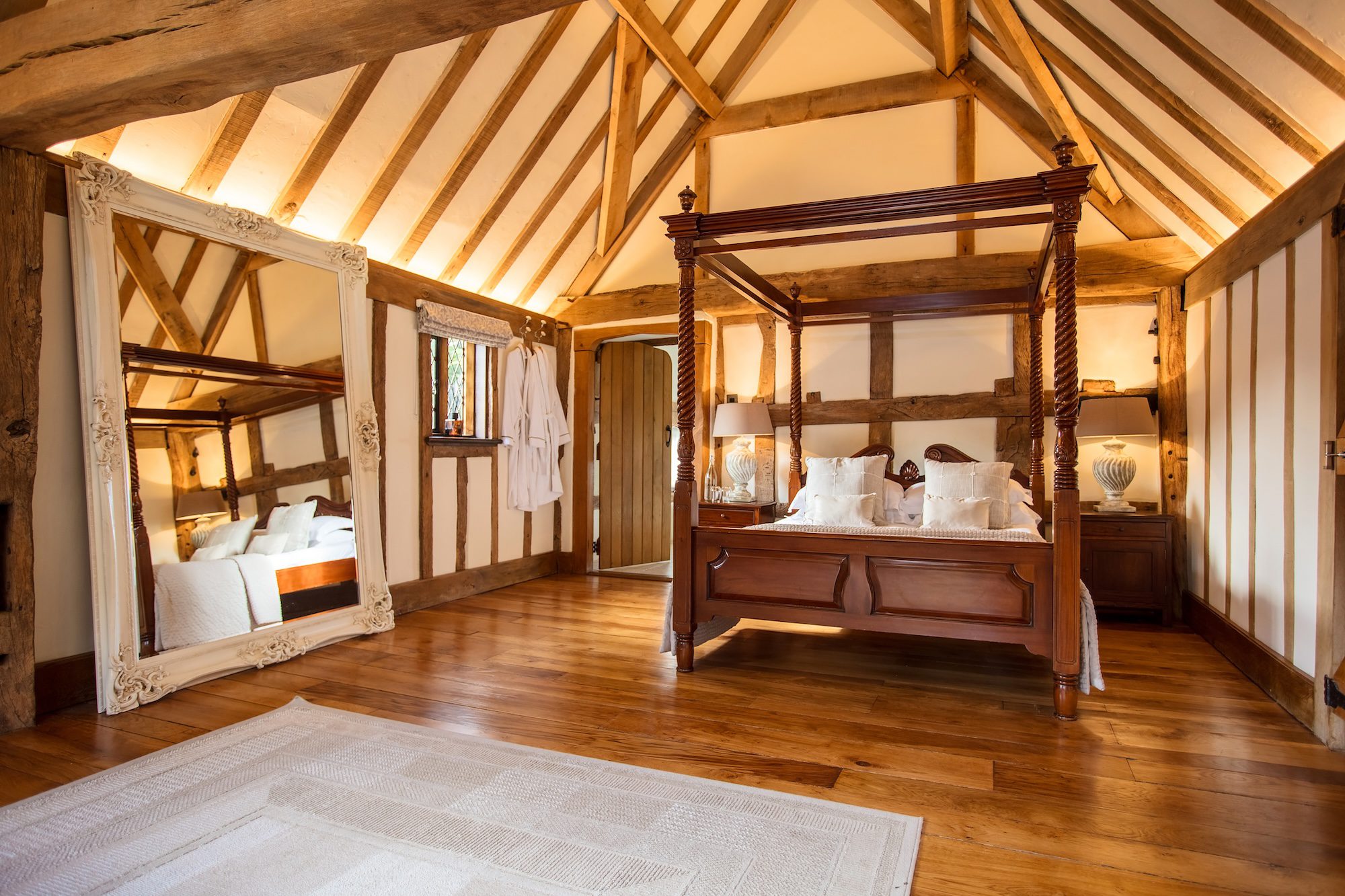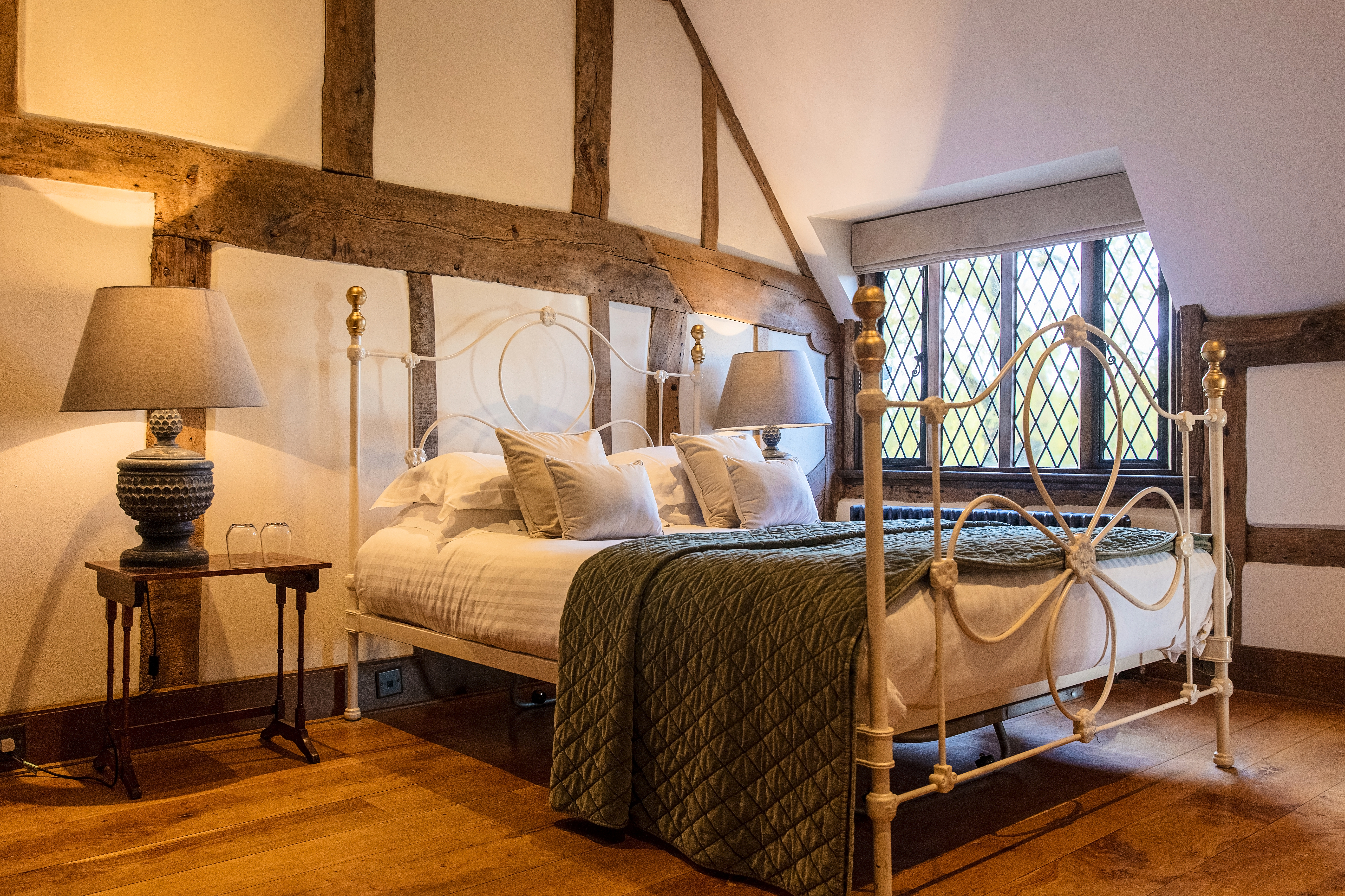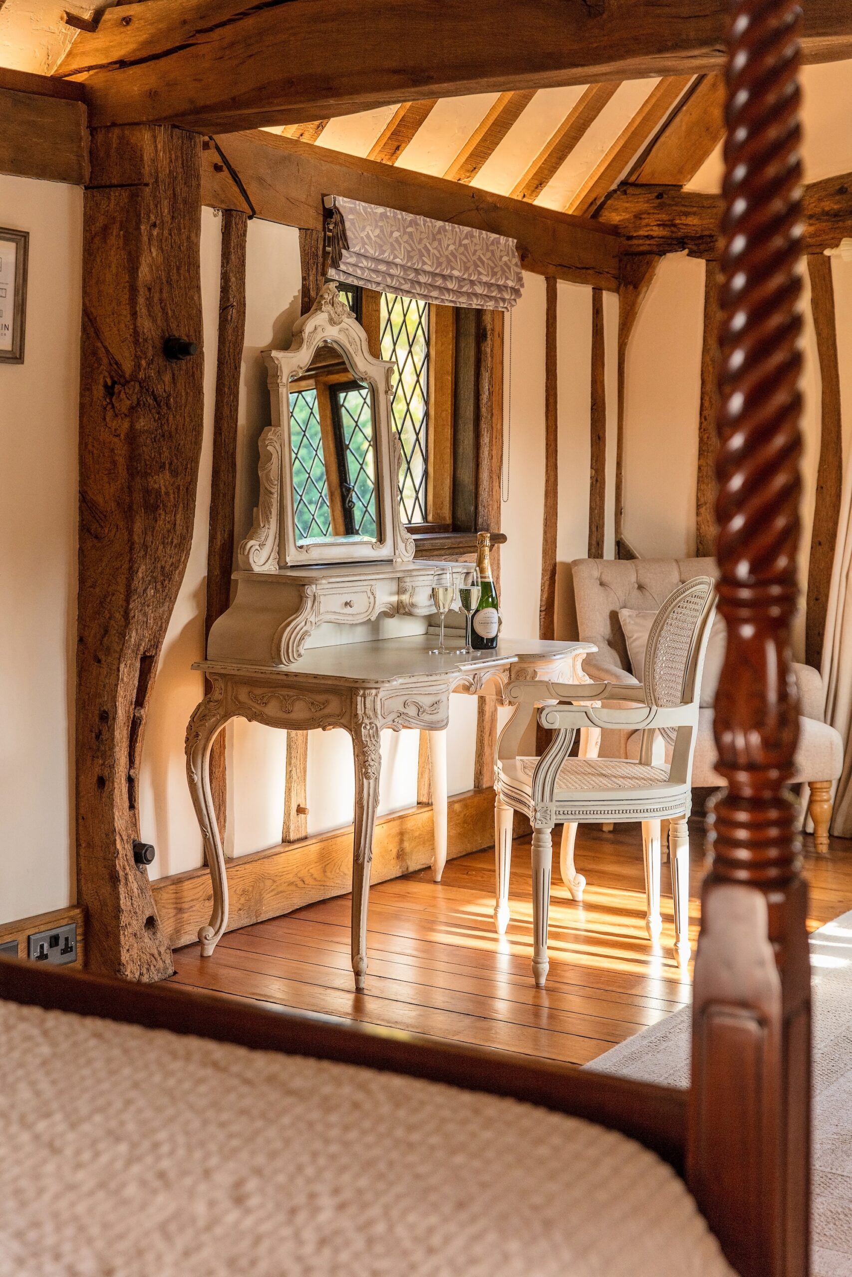 Your wedding night sanctuary at our Hampshire wedding venue, the Cain Suite is the finest of our eleven bedrooms, wrapped in original beams and warm character, with a spacious en-suite featuring a perfectly positioned roll-top bath overlooking the Surrey Hills. Natural light pours through the Tudor windows – perfect for wedding photos.