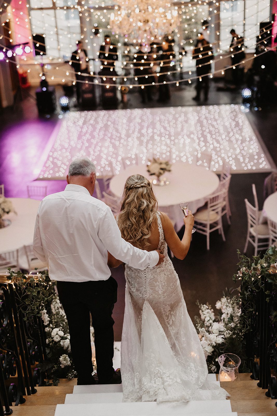 The wedding breakfast in the Atrium was magical – fairy lights twinkling overhead, tall floral centrepieces catching the light. While the Botleys team transformed the space for the evening, guests were treated to bespoke “his and hers” cocktails (a Mojito for her, an Old Fashioned for him). Then came the dancing – Soho Collective kept the LED dancefloor packed until late, with a hog roast buffet keeping everyone fuelled for the party.