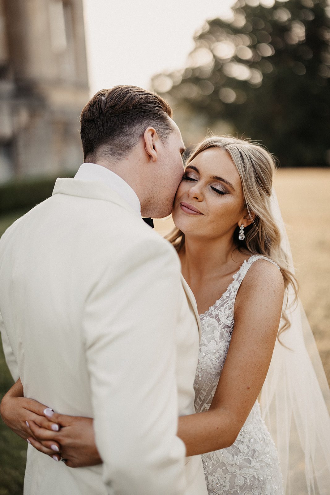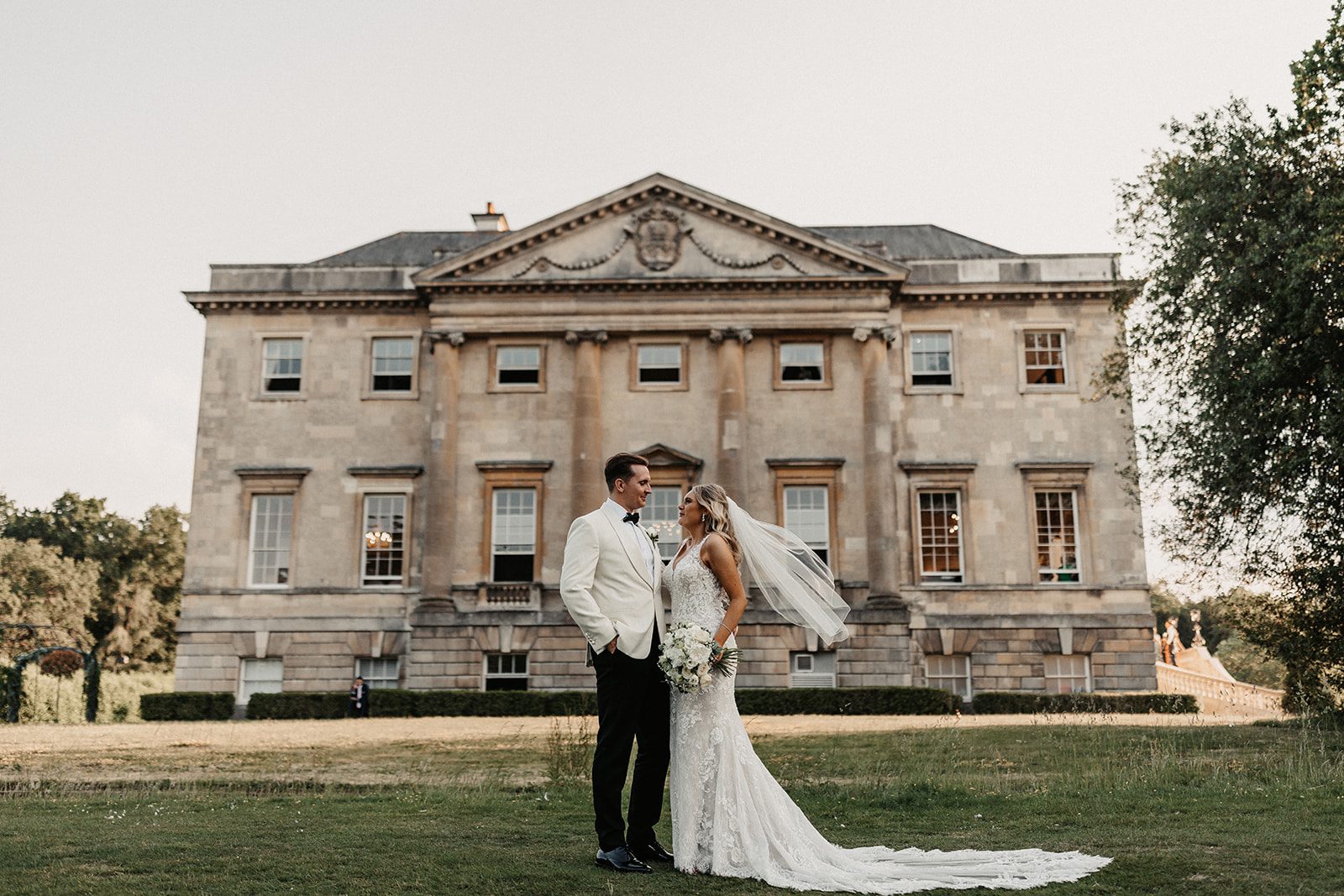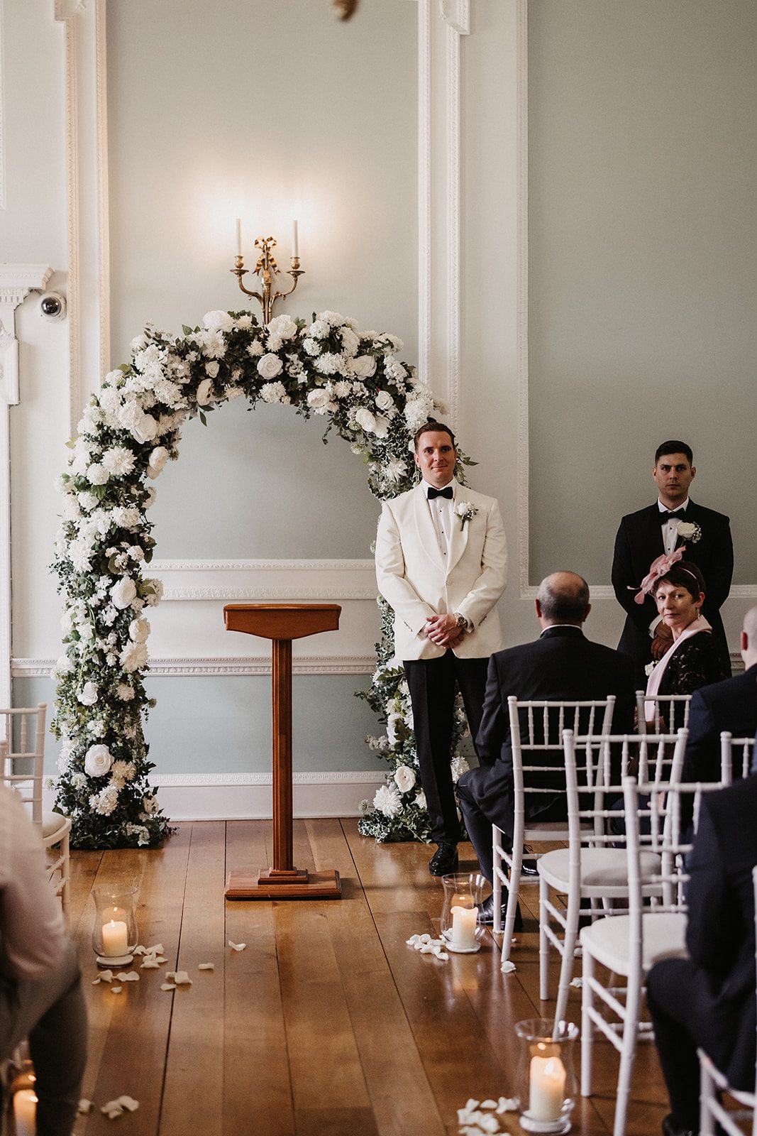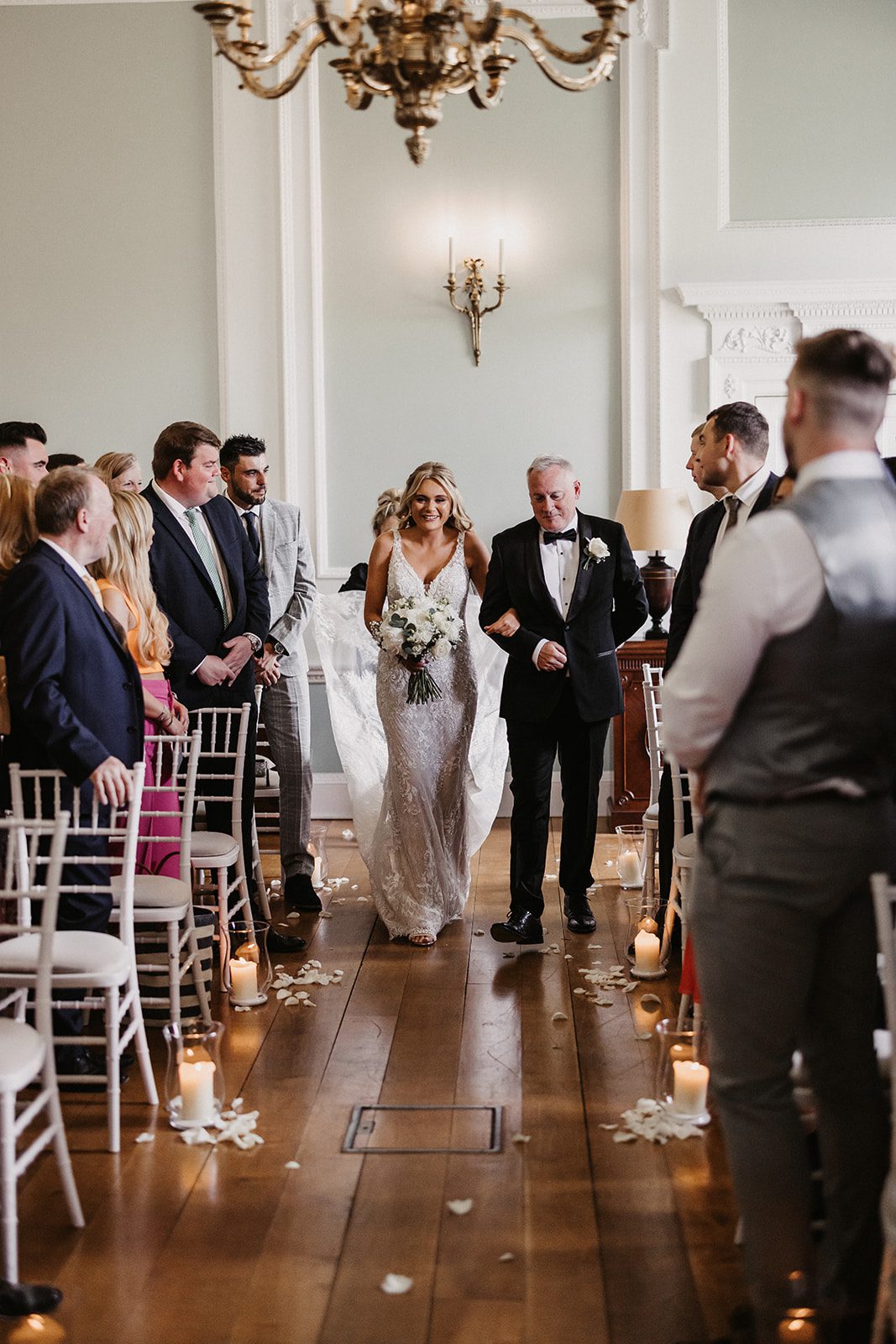 They said their vows in the Green Room, with candlelight lining the aisle and white roses with soft foliage framing the ceremony. Afterwards, guests spilled into the grounds for drinks and canapés while a violinist played, making the most of having this country house wedding venue entirely to themselves.