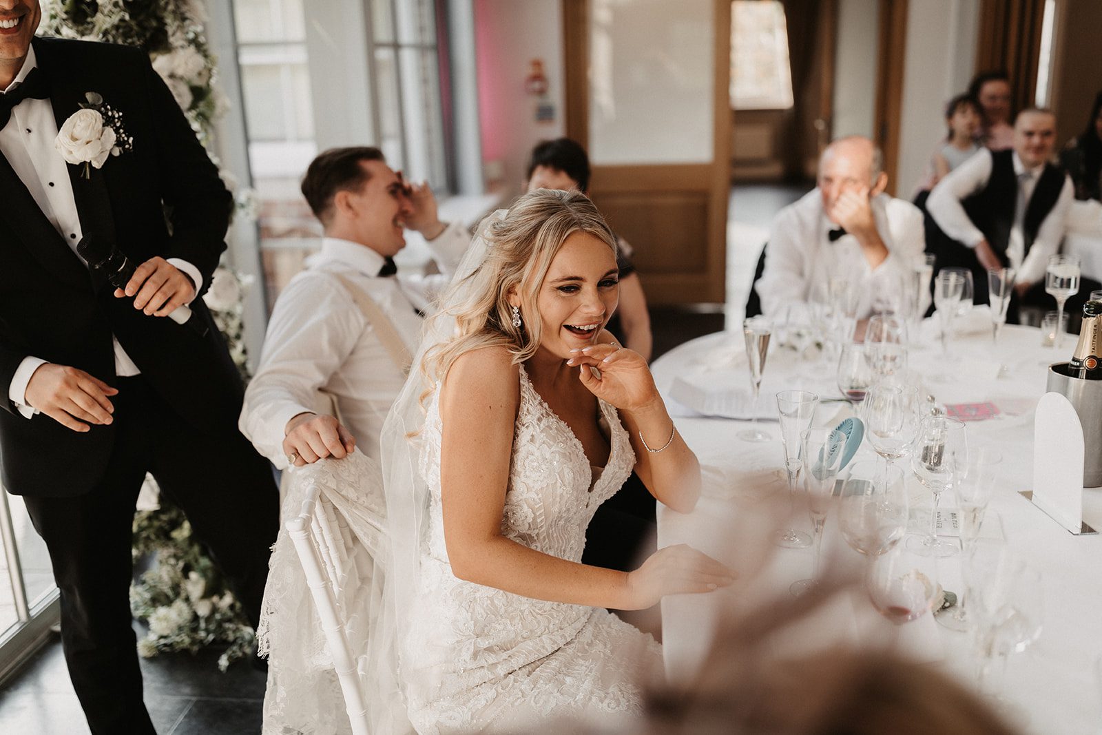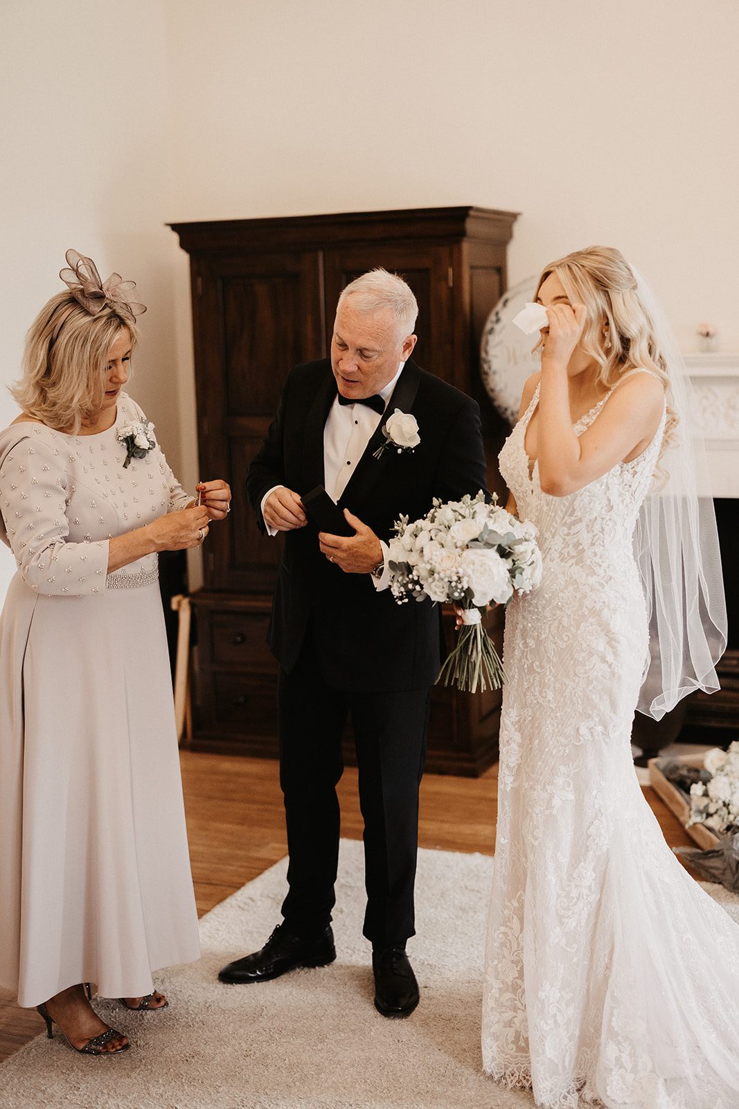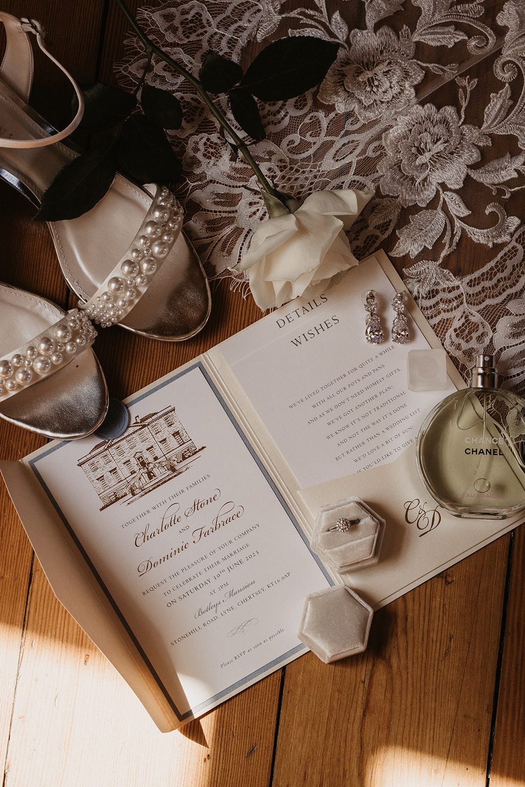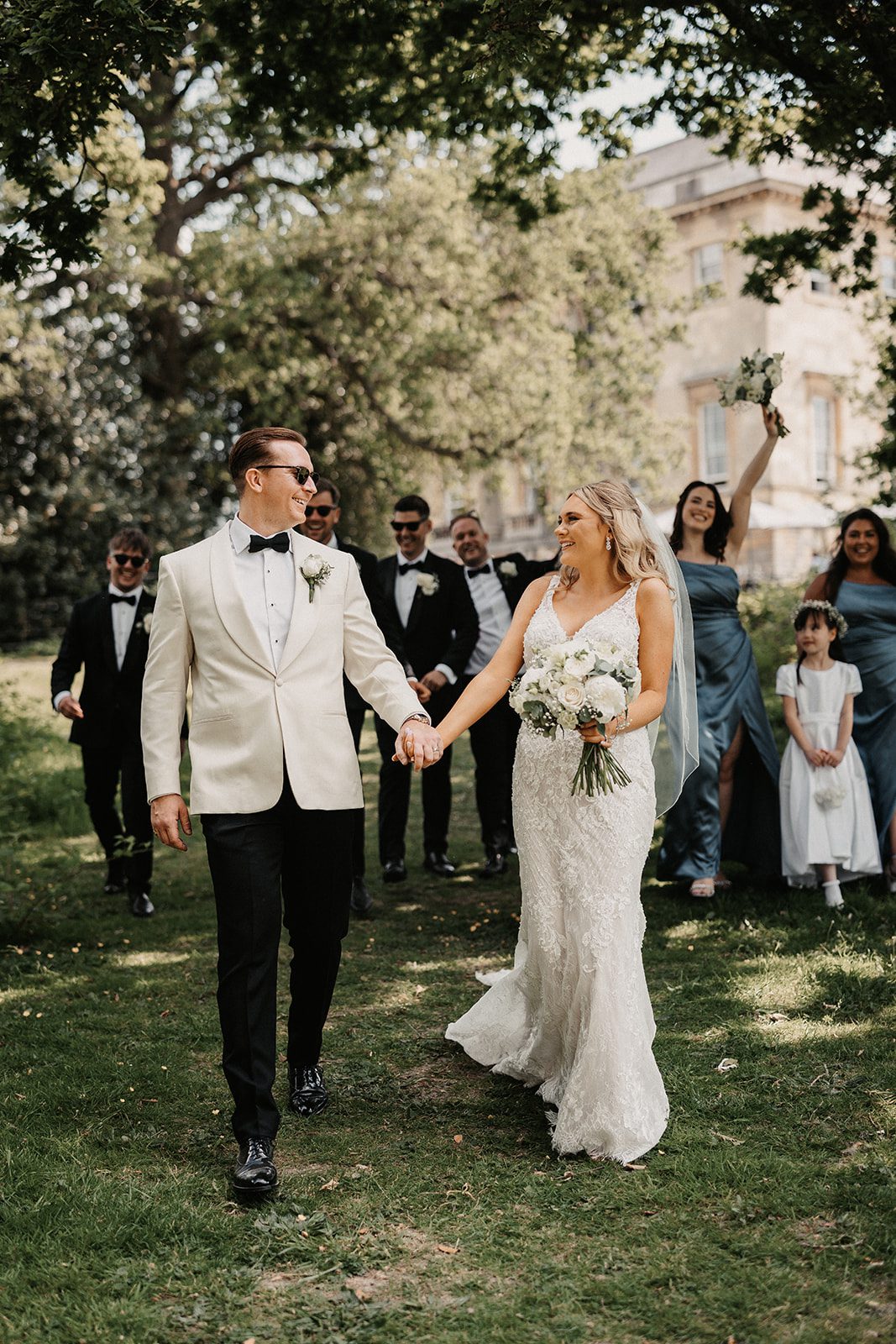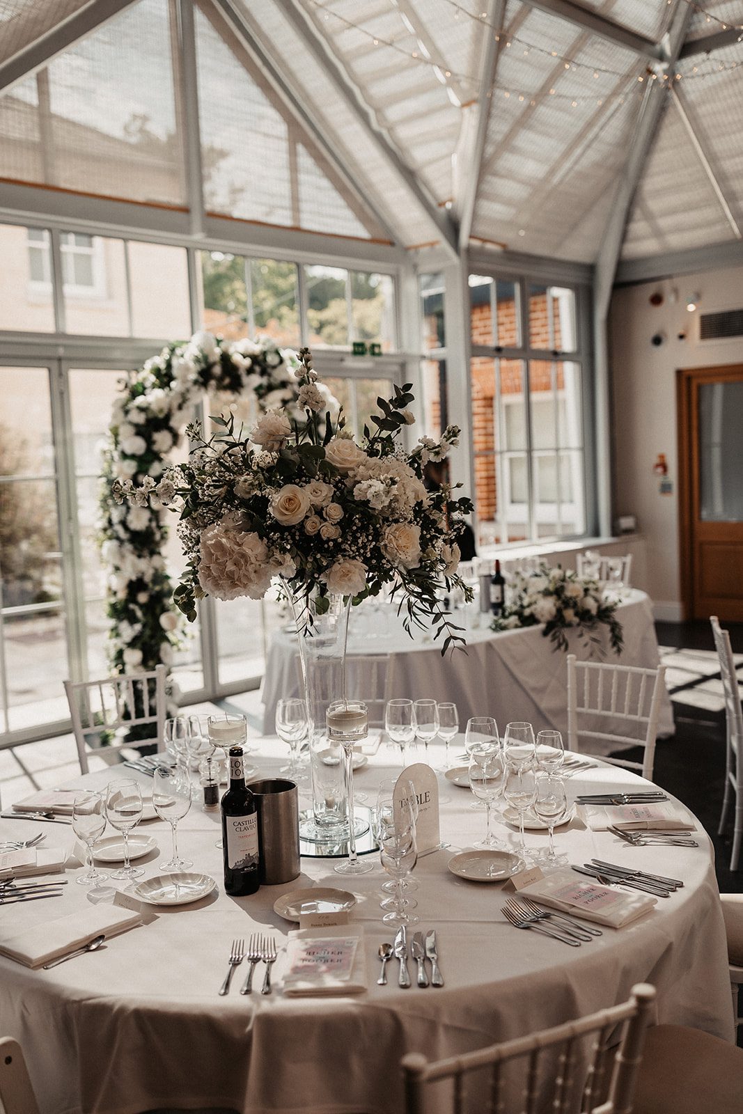 They said their vows in the Green Room, with candlelight lining the aisle and white roses with soft foliage framing the ceremony. Afterwards, guests spilled into the grounds for drinks and canapés while a violinist played, making the most of having this country house wedding venue entirely to themselves.