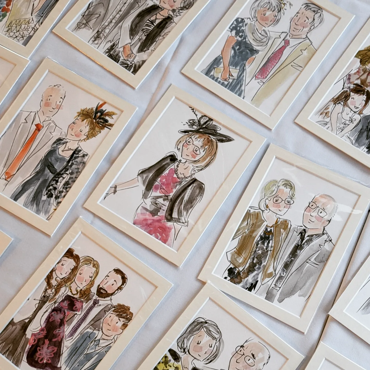SP Wedding Art specialises in fast, whimsical and flattering watercolour illustrations of wedding guests – painted live on your Big Day. The paintings are packaged with a frame mount, and displayed on mini easels to create a gallery for your guests to enjoy, before being collected to take home as gifts from the Happy Couple.