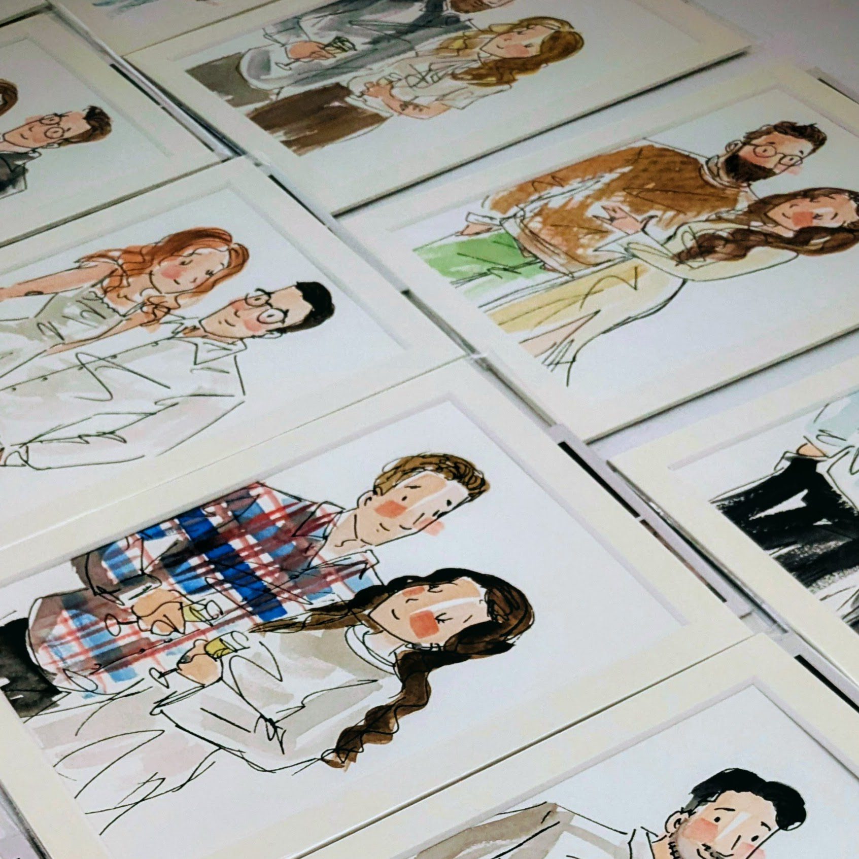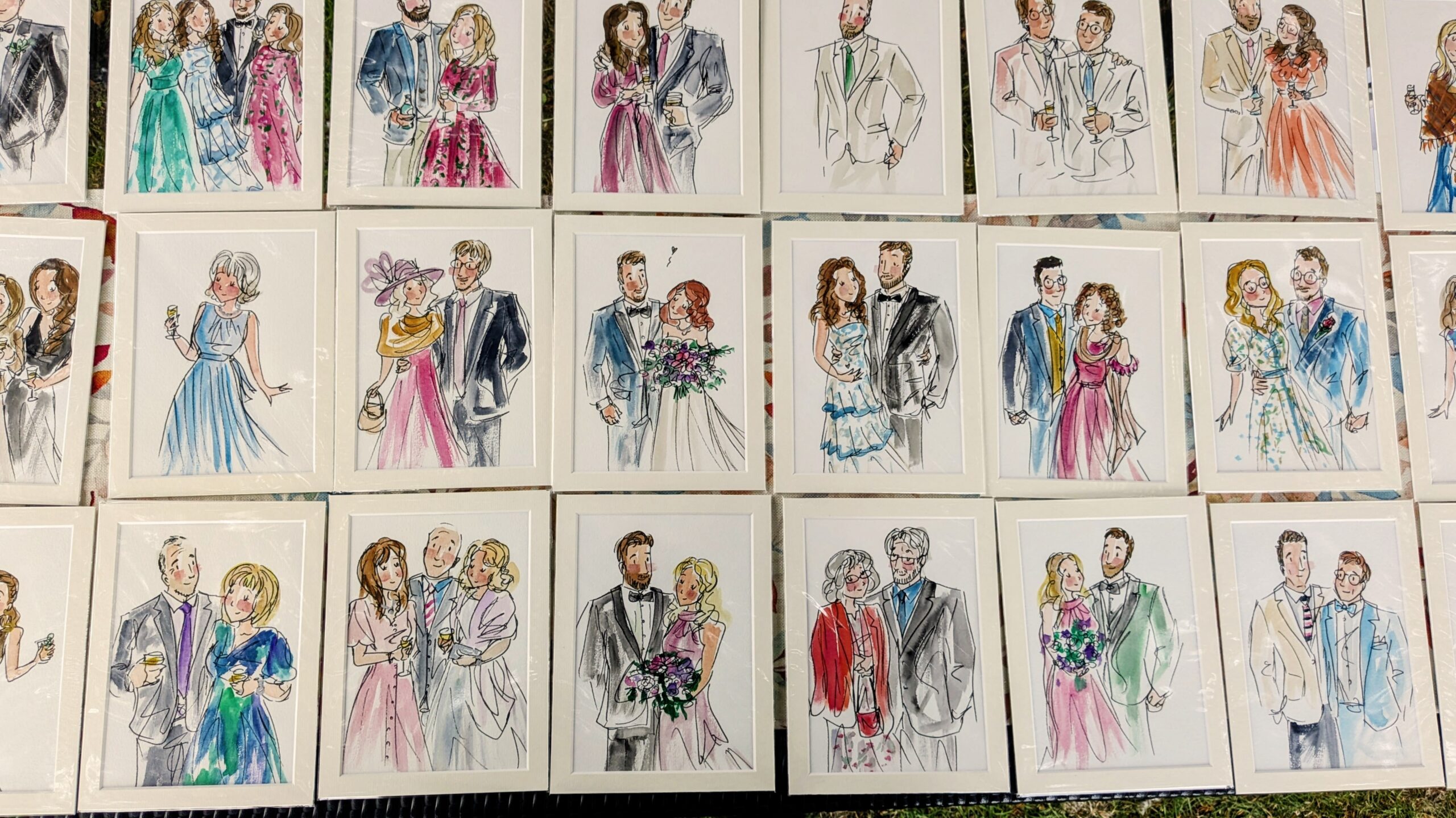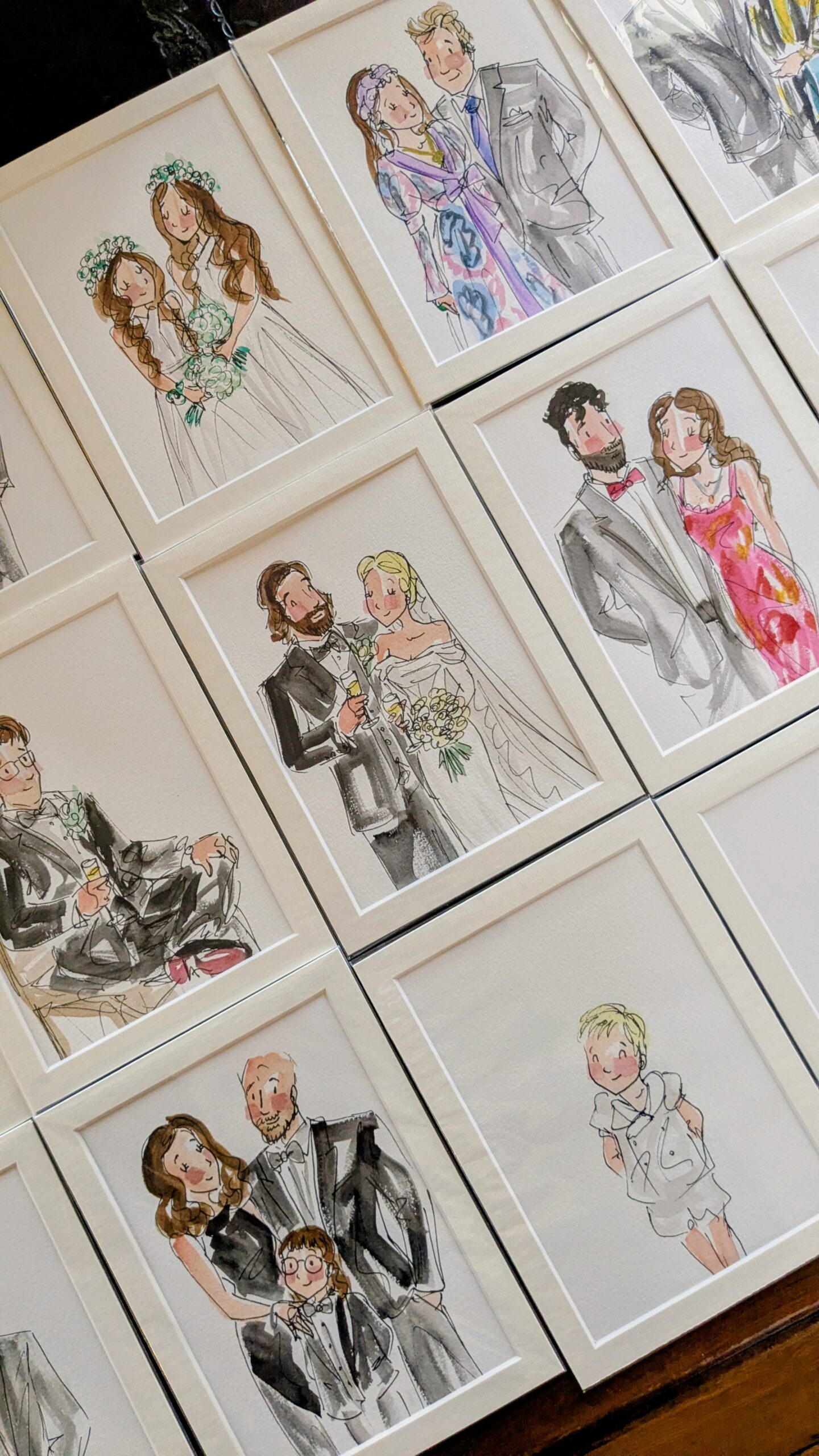 SP Wedding Art specialises in fast, whimsical and flattering watercolour illustrations of wedding guests – painted live on your Big Day. The paintings are packaged with a frame mount, and displayed on mini easels to create a gallery for your guests to enjoy, before being collected to take home as gifts from the Happy Couple.