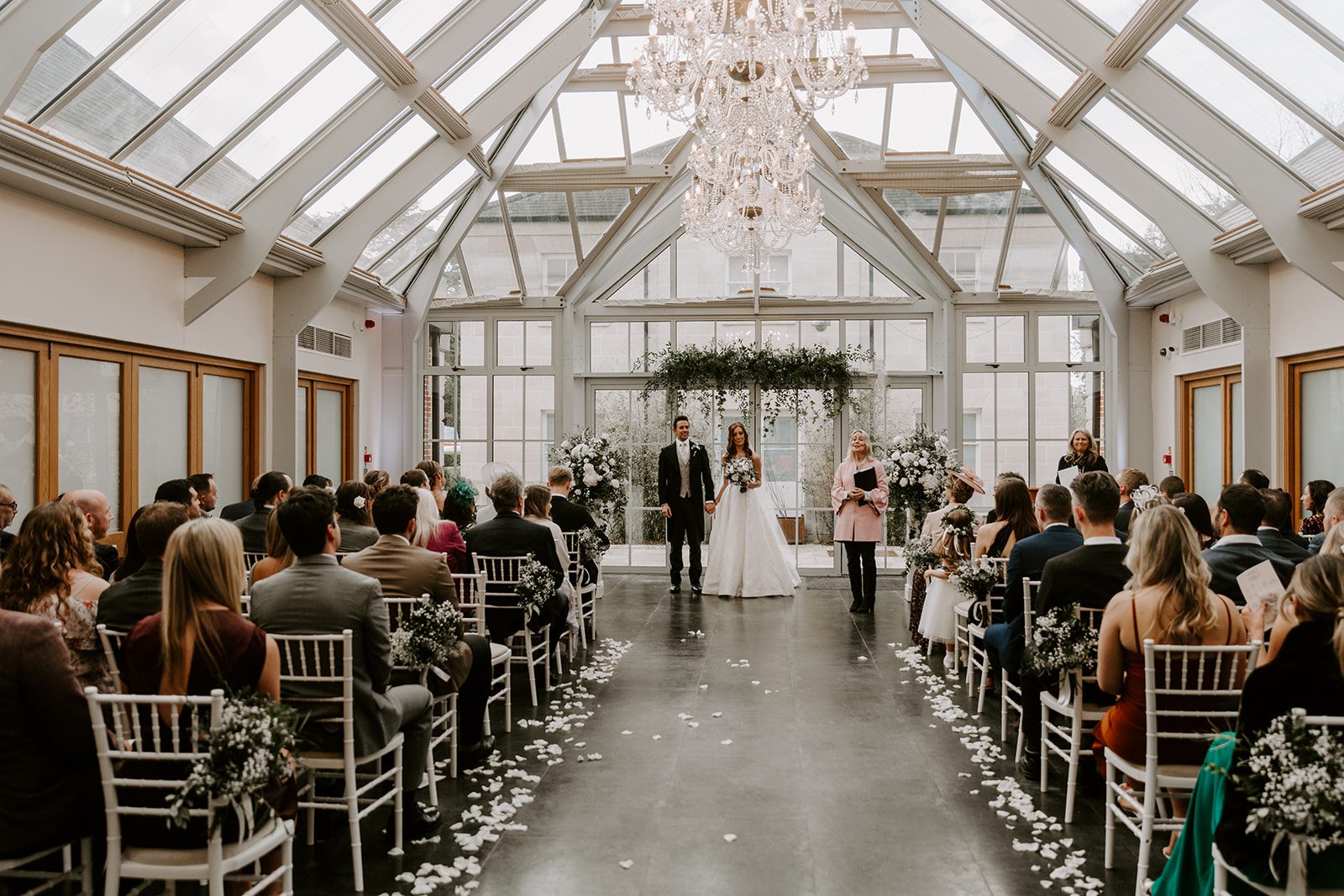 Victoria and Ben’s wedding at Botleys Mansion was a day filled with timeless elegance and stunning floral displays. Their ceremony took place in the Atrium, where sunlight came flooding through the windows, illuminating the space and highlighting the aisle’s tasteful and timeless neutral décor. The bridal party brought a touch of sophistication in their gorgeous dark sage bridesmaids’ dresses, perfectly complementing the neutral colour scheme. As the sun set, the festivities ramped up with a fun-filled evening reception, complete with dancing and laughter echoing through the venue. The couple’s magical day concluded with an unforgettable sparkler send-off, as their loved ones lit up the night sky in front of the grand stone staircase.